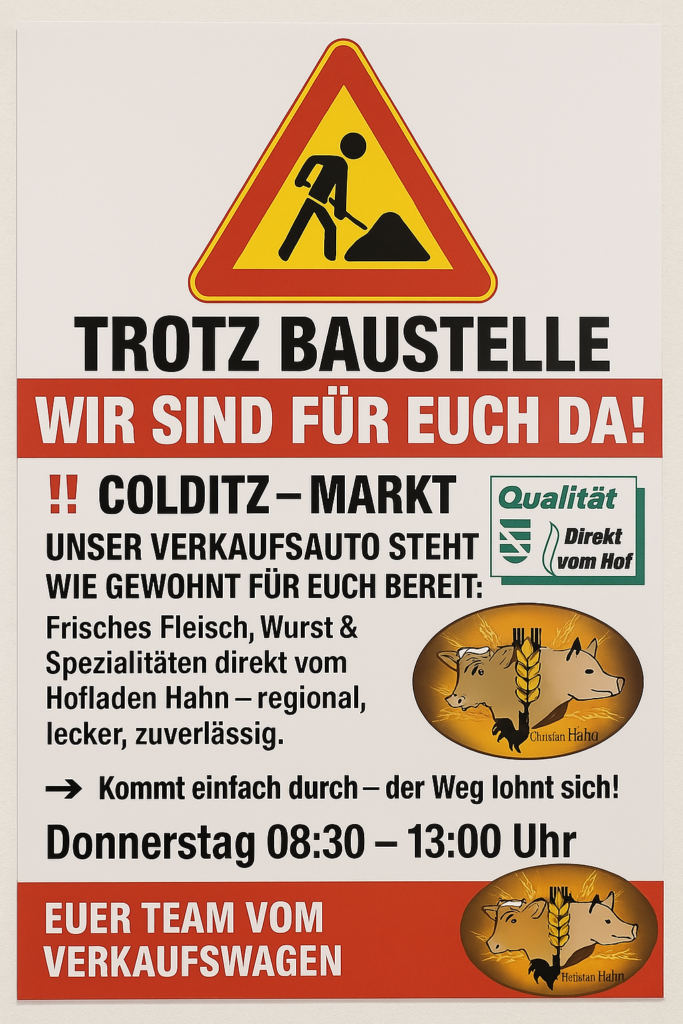 Wir sind wie gewohnt jeden Donnerstag von 08:30 – 13:00 Uhr mit unserem Verkaufsauto auf dem Markt in Colditz für euch da! 🥩🚛