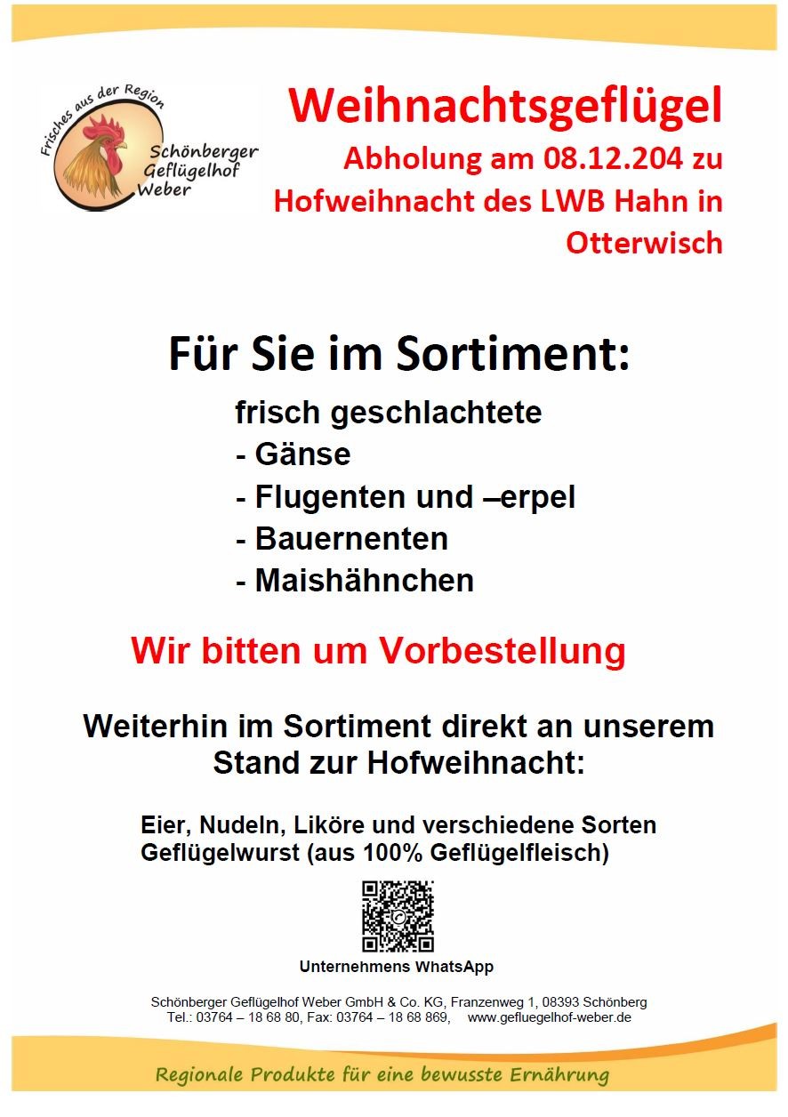 Zu unserer Hofweihnacht am 08.12.2024 können Sie wieder Ihr Weihnachtsgeflügel beim Schönberger Geflügelhof Weber vorbestellen!