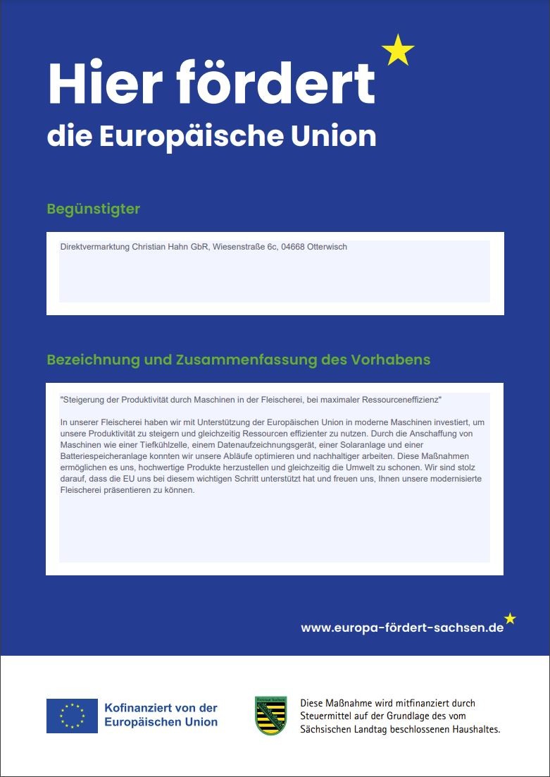 In unserer Fleischerei haben wir mit Unterstützung der Europäischen Union in moderne Maschinen investiert, um unsere Produktivität zu steigern und gleichzeitig Ressourcen effizienter zu nutzen. Durch die Anschaffung von Maschinen wie einer Tiefkühlzelle, einem Datenaufzeichnungsgerät, einer Solaranlage und einer Batteriespeicheranlage konnten wir unsere Abläufe optimieren und nachhaltiger arbeiten.